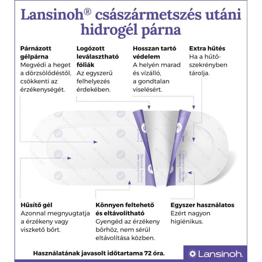 Gyengéd és hatékony megoldást kínál azoknak a császármetszéssel szülő anyukáknak, akik meg akarják védeni a heget a ruházat dörzsölésétől. Hűsítő, nyugtató és viszketést megszüntető hatása miatt is hasznos.Minőségét, biztonságosságát és hatékonyságát orvostechnikai eszköz besorolása garantálja!A műtét után 10 nappal használható, amikor a kapcsokat, varratokat eltávolították, vagy a varrat felszívódott.A metszés miatt a kismamáknak gondot okozhat a mozgás, újszülöttjük gondozása. A seb helye érzékeny lehet, hajlamos a ruházat miatti dörzsölődésre, de viszkethet is.1 csomagban 2 db hidrogél párnát tartalmazA Lansinoh császármetszés utáni hidrogél párna Magas víztartalma miatt nedves környezetet biztosít, amit meg is tart a bőr gyógyulásához. Megszünteti a heg érzékenységét, viszketését, védi a ruházat dörzsölésétől. Hűsítő, főleg ha használat előtt hűtőbe teszed. Vízálló, zuhanyzás közben is viselhető. Diszkrét, akár 72 órán keresztül használható. Higiénikus, egyszer használatos, egyesével csomagolt.Ha fertőzést vagy annak gyanúját tapasztalod, akkor ne használd, hanem fordulj orvoshoz!Használata:1.lépés: Győződj meg arról, hogy a terület tiszta és száraz, mielőtt felhelyezed a hidrogél párnát. 2.lépés:Nyisd ki a tasakot és húzd ki a párnát3.lépés:Távolítsd el az 1.jelű védőpapírt4.lépés:Finoman helyezd a párna zselés oldalát közvetlenül a császármetszés hegére.Középről kifelé haladva gyengéd, simító mozdulatokkal rögzítsd a párnát.5.lépés:Távolítsd el a 2. védőpapírt is. A párna eltávolításakor finoman emeld meg a felső szélekről indulva lefelé, figyelj, hogy alul a szőrnövekedés irányába húzd. A hűsítő hatás érdekében használat előtt tárold a párnát hűtőszekrényben. Ne használd a párnákat más olajokkal, krémekkel vagy kenőcsökkel, mert az akadályozhatja a párna megtapadását.Figyelmeztetés: Kizárólag az útmutatónak megfelelően használd!Ellenjavallatok: Nincs ismert ellenjavallat.