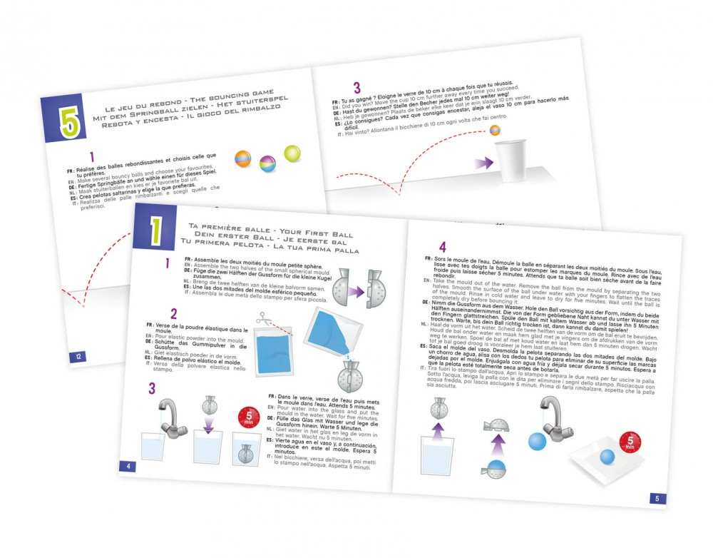 • Kísérleti eszközök: A készlet tartalmaz minden szükséges eszközt a pattogó labda elkészítéséhez (pl. porok, formák, mérőedények).