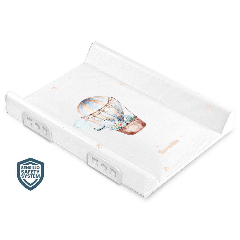 A vidám nyomatokkal ellátott Sensillo párnázott pelenkázólap a legkisebbek kényelmes gondozásának gondolatával készült. A készletben található lábak lehetõvé teszik a biztonságos és stabil felszerelést közvetlenül egy 60 cm széles kiságyra. A pelenkázólap komódra vagy más stabil felületre is felszerelhetõ. A pelenkázóasztalt az innovatív Sensillo Safety System jellemzi, amely a kiegészítõ oldalerõsítéseknek köszönhetõen megakadályozza a gyermek kiesését. A gyártás során a legjobb minõségû anyagokat használtuk, amelyek maximális biztonságot és kényelmet biztosítanak. A Sensillo pelenkázólap teljesen biztonságos a gyermek egészségére nézve – nem tartalmaz ftalátokat, nehézfémeket és egyéb káros anyagokat.
