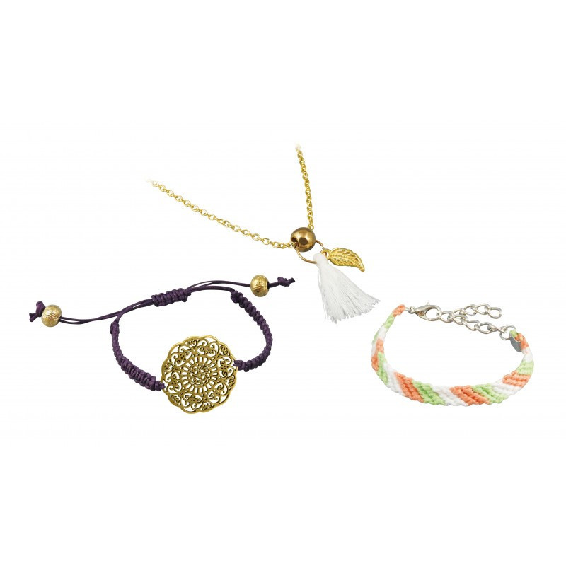 1 neszeszer táska, 1 vászon tasak, 1 szemhéjfesték paletta, 1 csillámos szemhéjfesték paletta, 1 pirosító paletta, 1 szájfény, 3 nagyobb méretű gyöngy, 1 charm, 1 mandala karkötő medál, 1 pompom dísz, 1 lila színű zsinór, 3 színes pamutfonál, 2 kapocs, 2 csatlakozó, láncok, 4 ékszer karika és 1 színes illusztrációkkal ellátott használati utasítás.