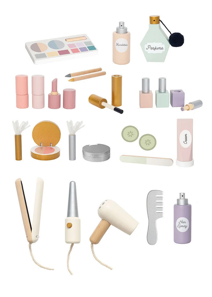 A szett 26 darabos, és minden szükséges eszközt tartalmaz, amire egy kis szépségszakértőnek szüksége lehet: