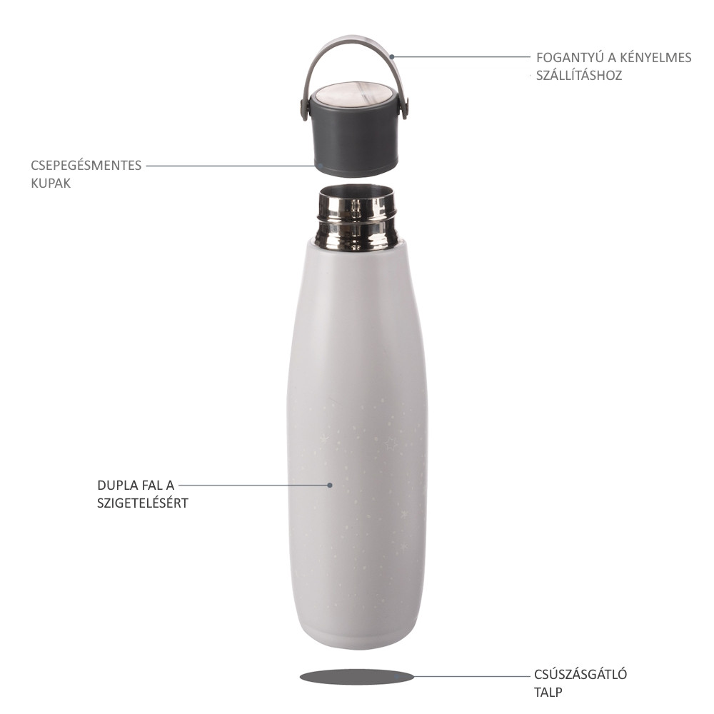 Hideg és meleg italok tárolására alkalmas, minőségi rozsdamentes acél, korrózió- és páralecsapódásálló, szoros kupak, akasztó, űrtartalom 480 ml.A kiváló minőségű 480 ml-es ital termoszban a forró italok akár 12 órán át, a hideg italok pedig akár 24 órán keresztül is tárolhatók. Kiváló minőségű rozsdamentes acélból készült, amely ellenáll a korróziónak. A szorosan záródó fedél biztosítja, hogy a termosz ne szivárogjon. A vákuumszigetelésnek köszönhetően a termosz kívülről nem melegszik fel forró folyadékkal megtöltve. A kényelmes fogás érdekében a termosz szilikon akasztóval van felszerelve.Társ minden utazáshozA műanyag kulacsokhoz képest a rozsdamentes acél anyag nem szívja fel a szagokat és foltálló. Ráadásul szállítás közben sem szivárog ki a folyadék, ahogyan egyes műanyag kulacsokból vagy itatópoharakból, amik nem zárnak jól.A folyadékokhoz való termosz használatával segítesz csökkenteni a műanyagfogyasztást. A termosz kézzel mosható, mosogatógépben nem mosható.Tulajdonságok:- 480 ml űrtartalom- Alkalmas hideg és meleg italokhoz- Szorosan záródó fedél (csepegésmentes)- Kiváló minőségű rozsdamentes acél- Vákuumos szigetelés- Akár 12 órán keresztül melegen tartja a tartalmat- Akár 24 órán keresztül hidegen tartja a tartalmat– BPA mentes- ECO-friendly- 25 cm magas- súlya: 310g- átmérője: 7 cm